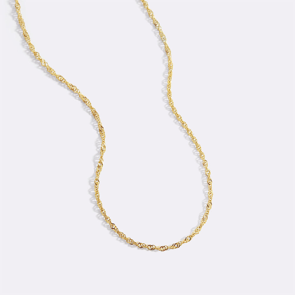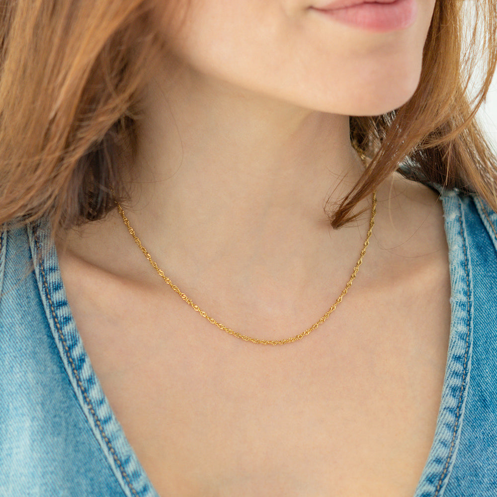 Sleek and sophisticated, this 2mm Singapore Twist Chain Necklace adds a touch of effortless elegance. Its intricate twist design catches the light beautifully, making it perfect for layering or wearing solo.