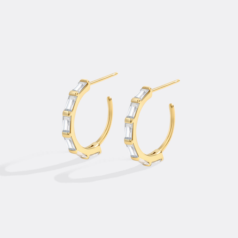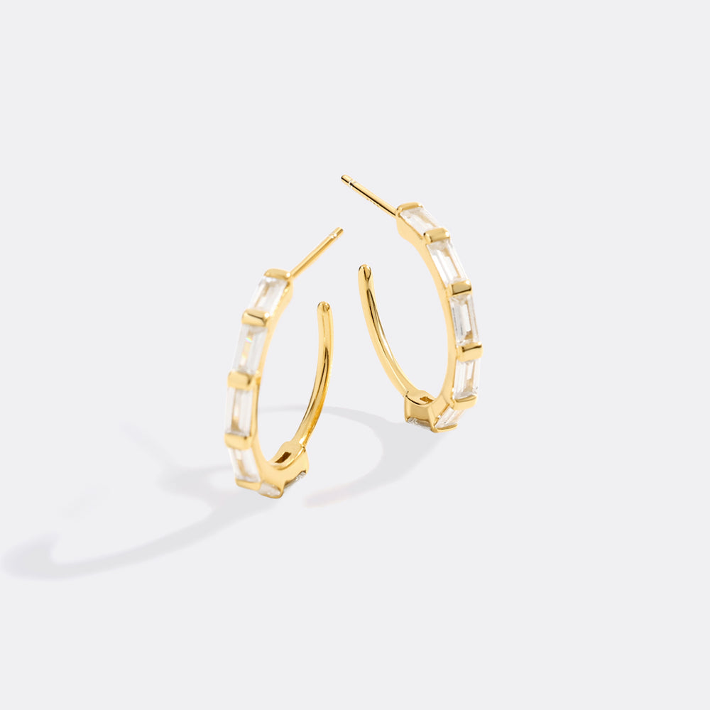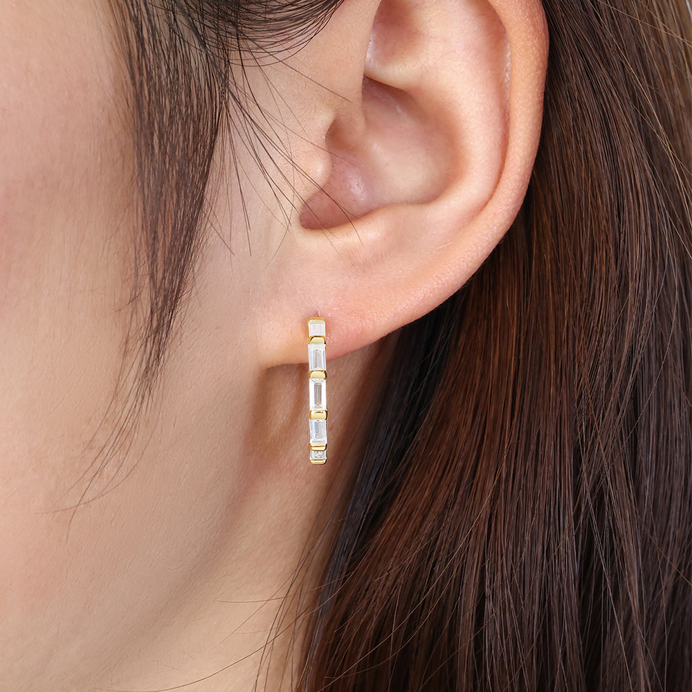 Elevate your everyday with a touch of refined brilliance. These hoops feature a sleek silhouette adorned with baguette-cut white diamonds, creating a radiant and timeless look that transitions effortlessly from day to night.