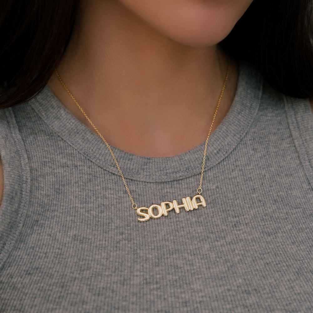 This playful piece features your name crafted in a fun, balloon letter style, adding a whimsical touch to your jewelry collection.