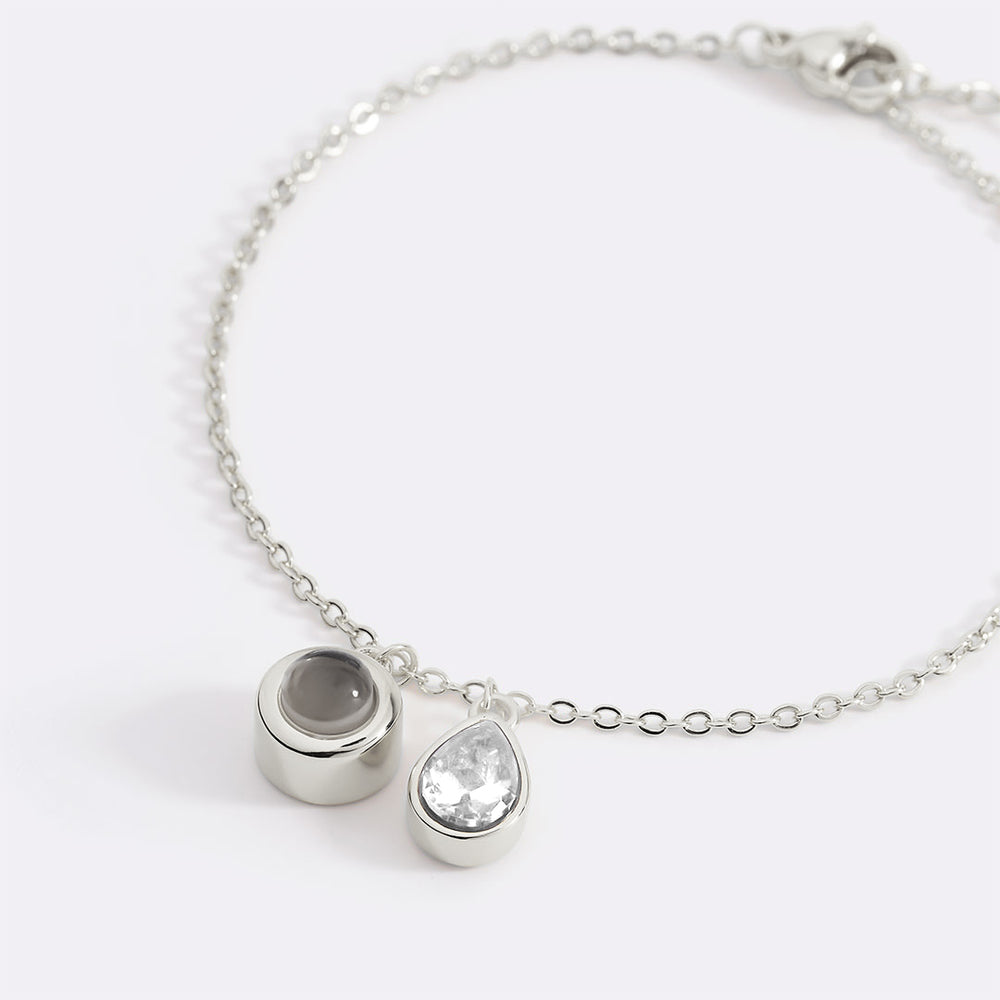 Carry who you love wherever you go—a custom photo projection bracelet engraved with your favorite image plus a sparkling birthstone charm. Peek inside or shine a light to see your photo magically project.