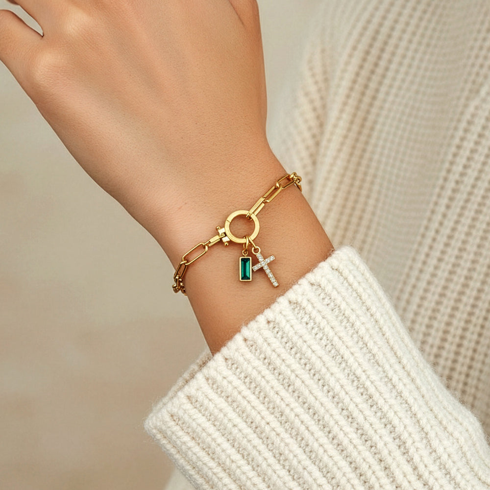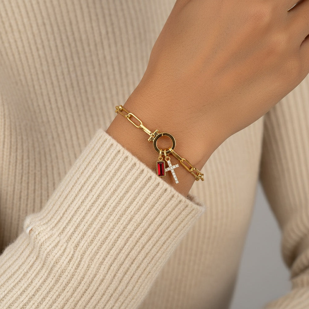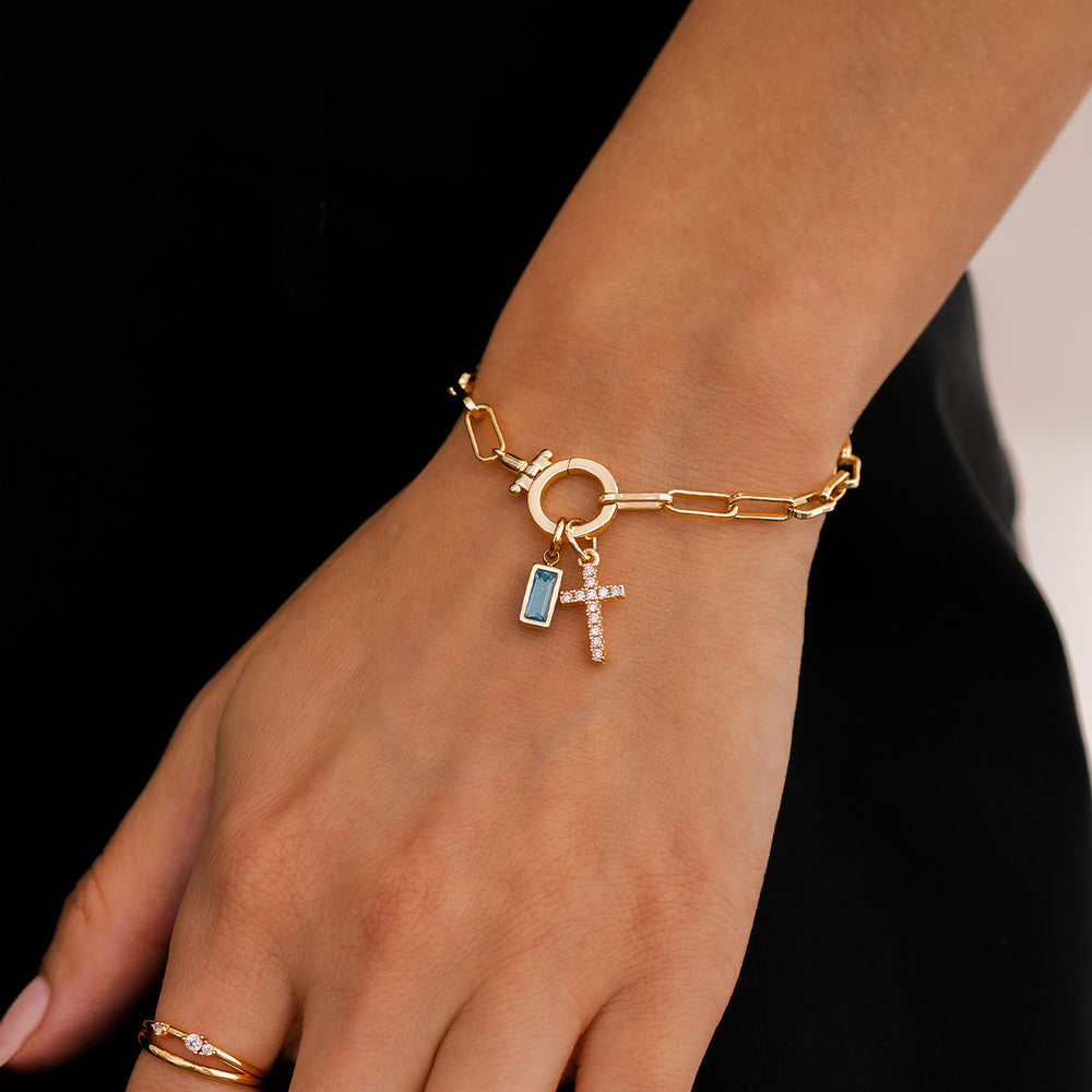 Grace meets meaning. This birthstone cross charm bracelet blends faith and personal touch in a sleek, modern design. A heartfelt piece to wear alone or layered effortlessly.