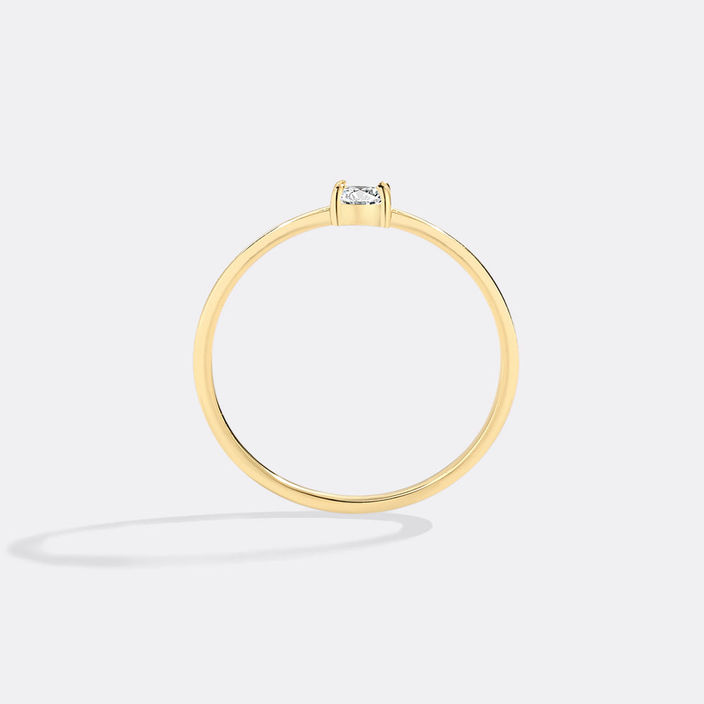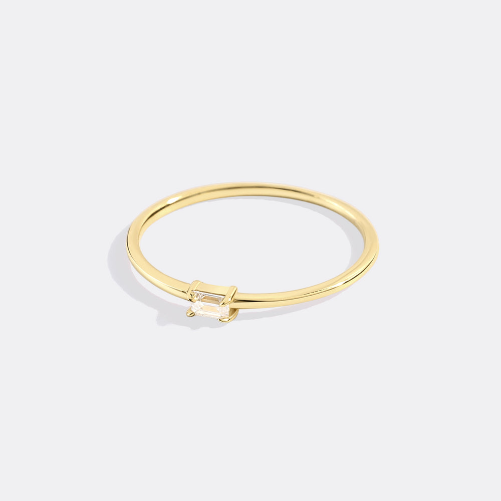 An elegant and simple baguette birthstone is prong-set in a simple band, which is meant to be worn alone or stacked well.