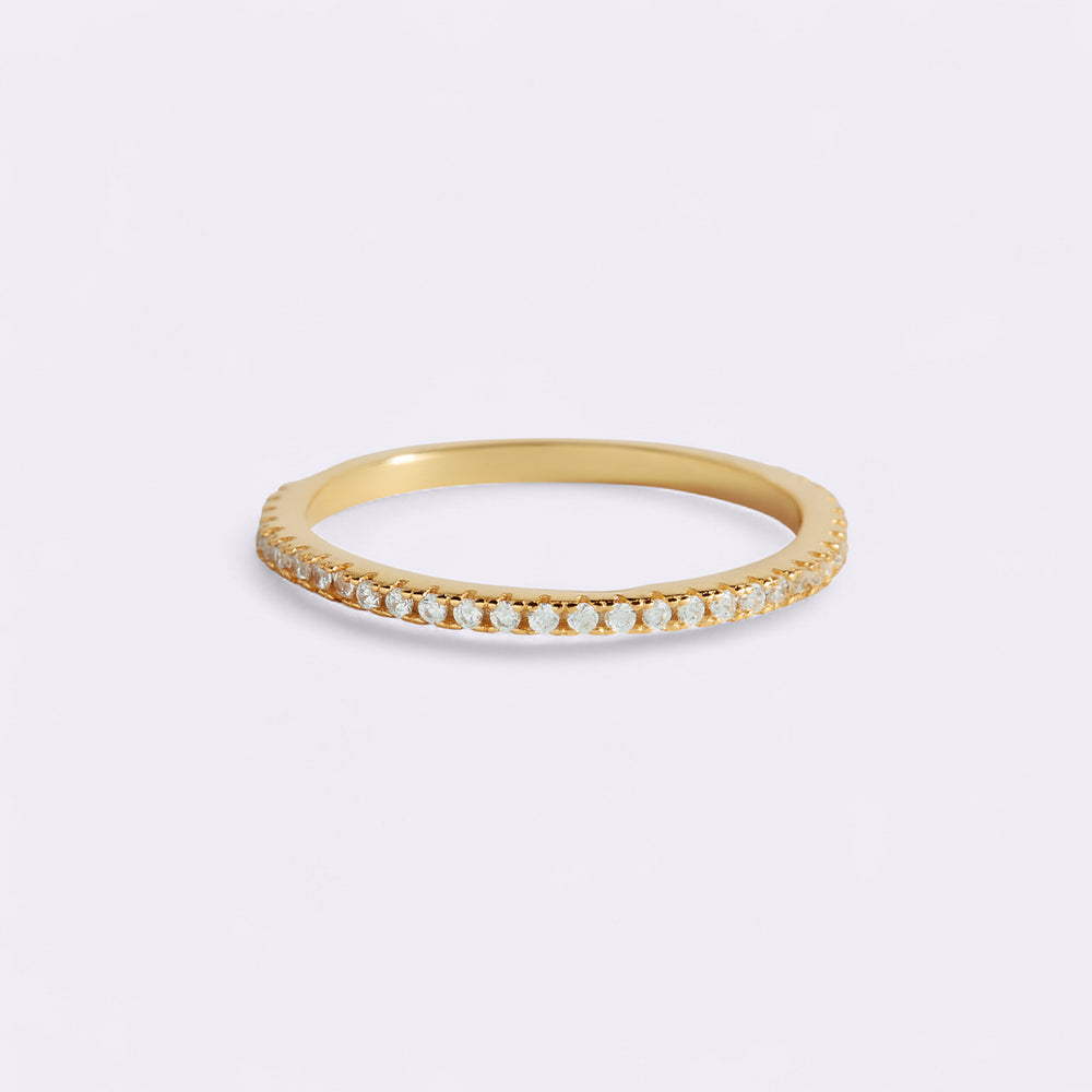 Designed with a sterling silver base, this ring is encircled by sparkling white zircon stones that mimic the brilliance of real diamonds. The continuous loop of stones symbolizes eternal love and commitment, making this ring an ideal choice for an anniversary gift or a wedding band.