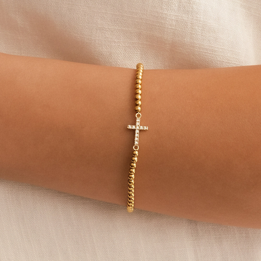 This chic bracelet features gold beads beautifully strung together, complemented by a sparkling diamond cross. Ideal for stacking or wearing solo, this bracelet makes a thoughtful gift or a stylish way to celebrate your faith.