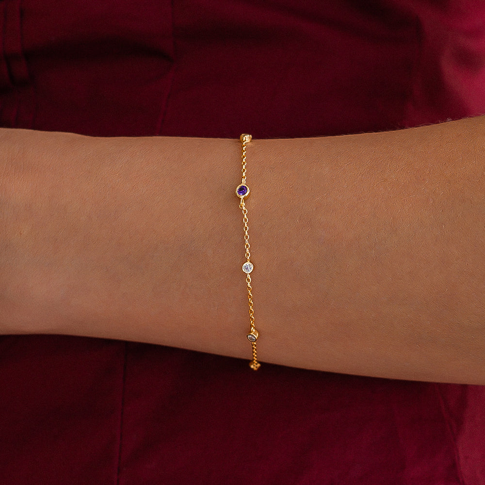 Celebrate every moment with a delicate birthstone bracelet, featuring your chosen gem framed by sparkling white gemstones. Perfect for layering or wearing solo, it adds a personal touch that feels both meaningful and timeless.
