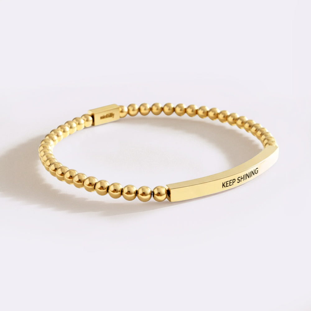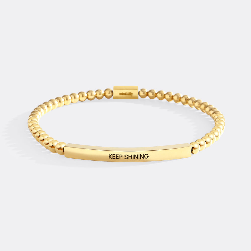 Let your light shine, always. The Keep Shining Beaded Inspire Bracelet features polished silver beads and an encouraging charm that reminds you to stay radiant and confident through every season. A simple yet powerful piece that inspires positivity—perfect for everyday wear or as a heartfelt gift.