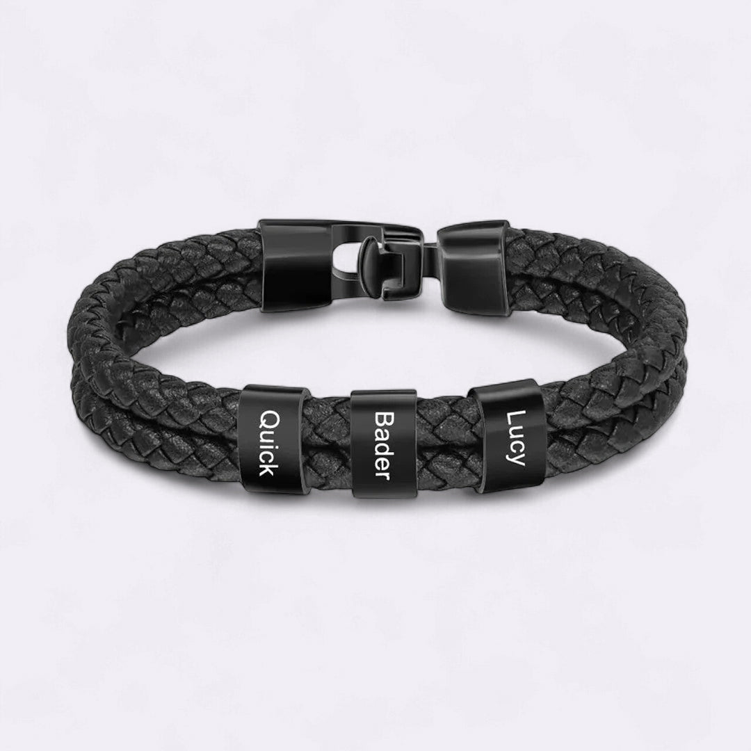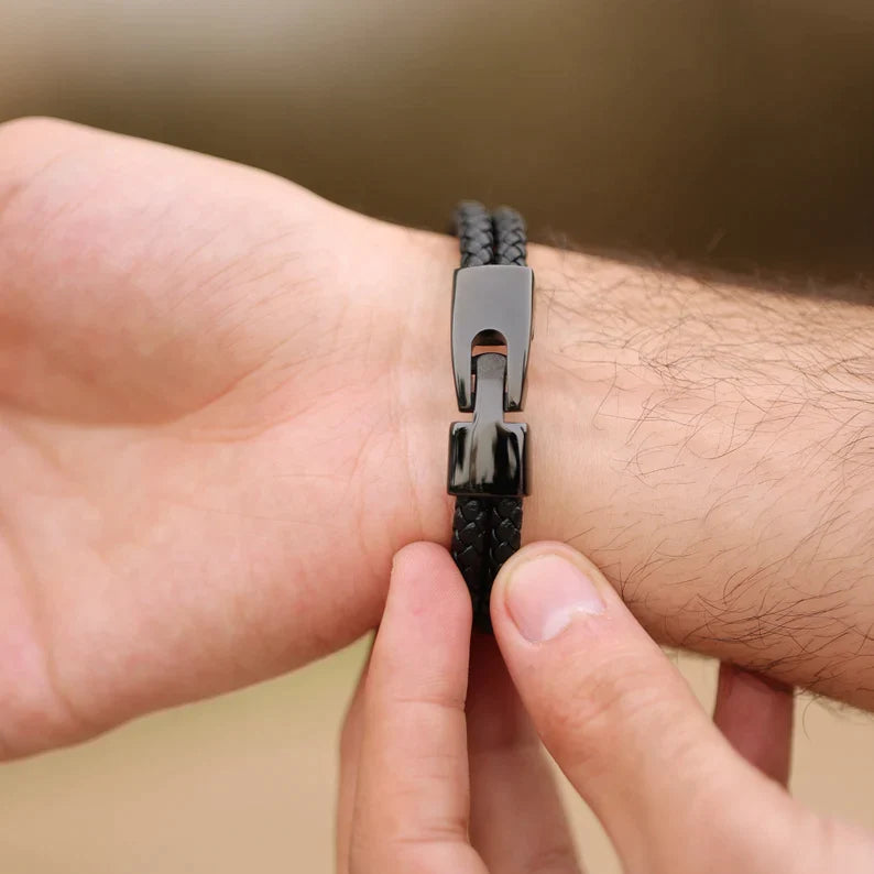 This handsome personalized bracelet features a sturdy braided band fastened with a solid clasp. The perfect jewelry for dad, grandpa or boyfriends, customize it with all the children's names or any other text you like. Comes in either black or silver, customize one just as you like!