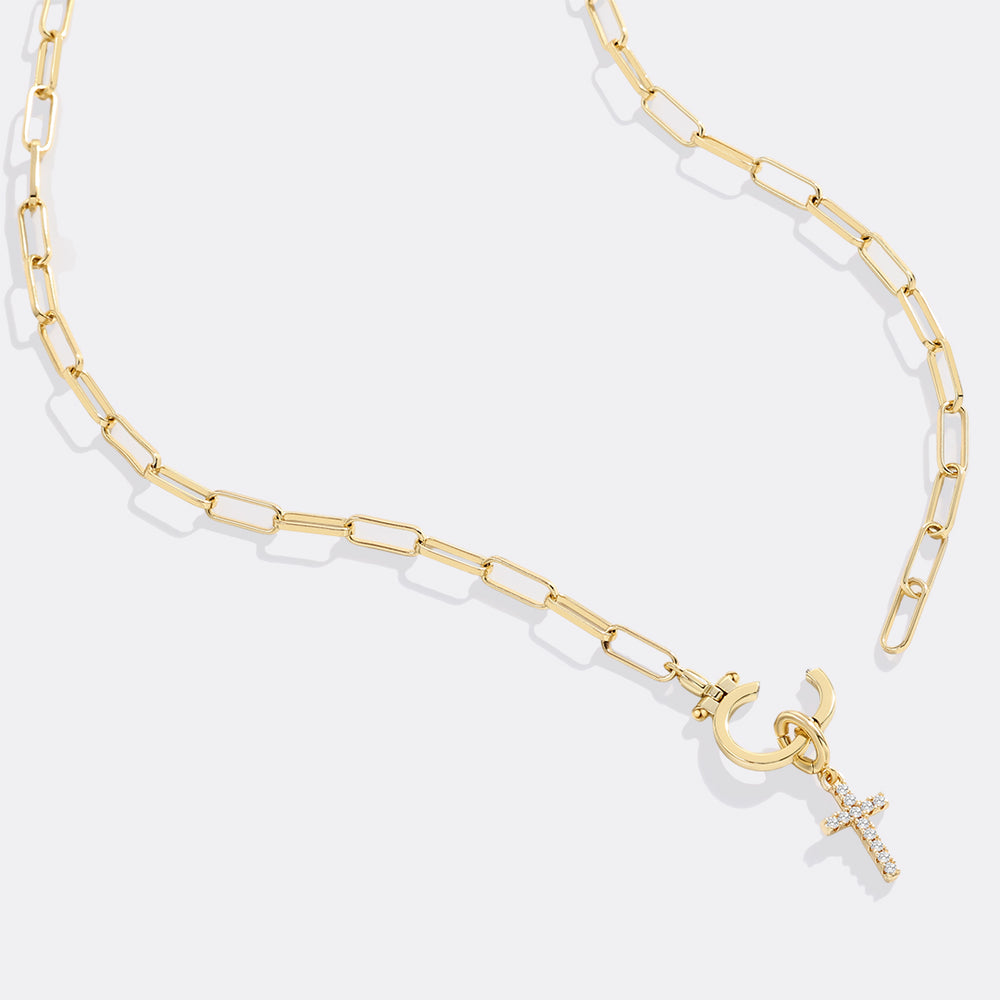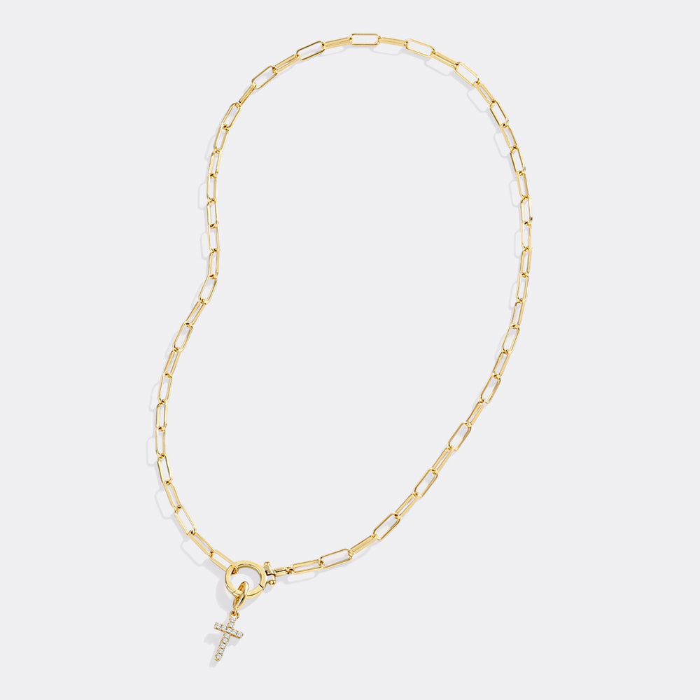 A light and airy paperclip cross necklace that balances bold shape and subtle meaning. The elongated chain links cradle a pavé cross charm that glimmers just enough to feel special without shouting.