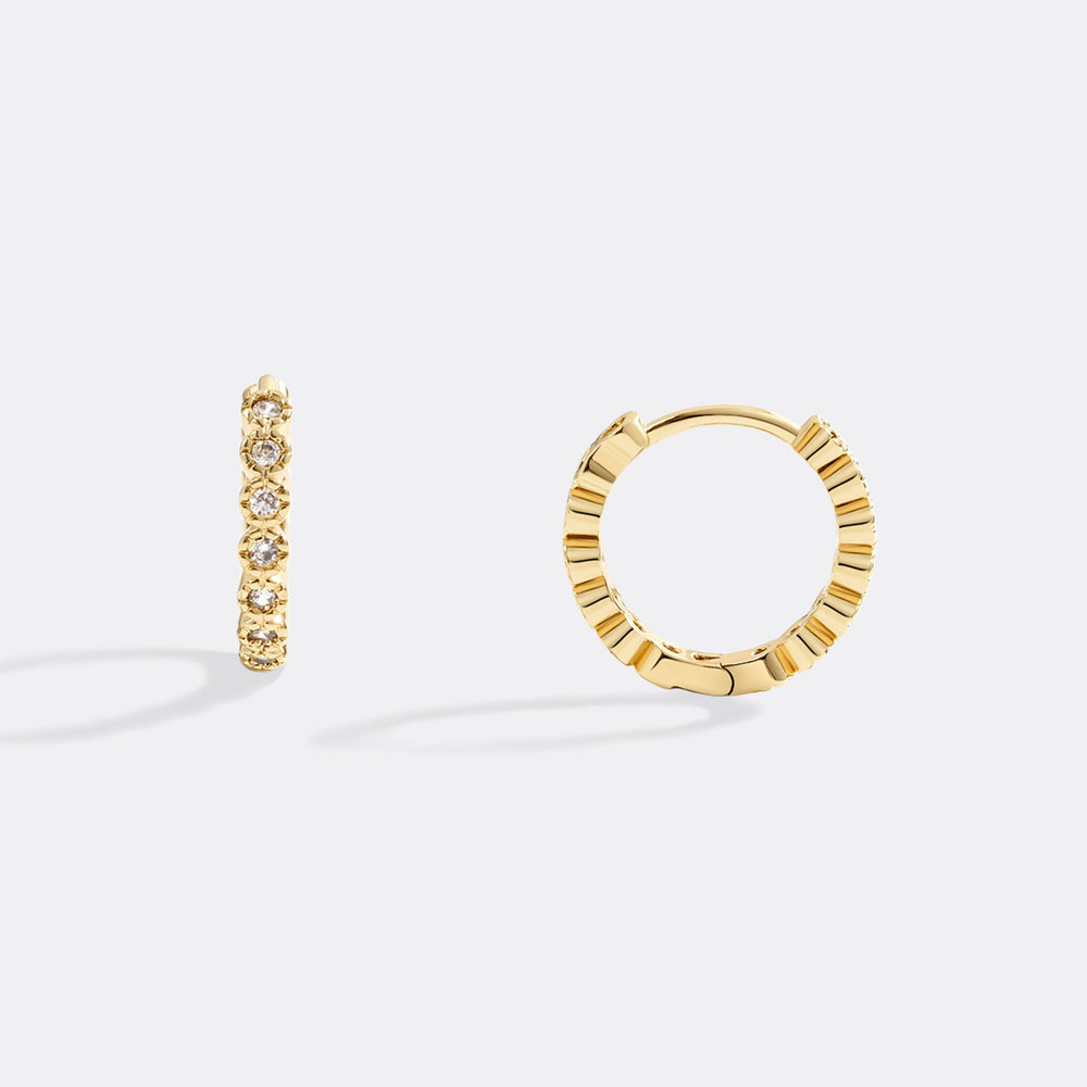 Elevate your everyday look with the Shimmer Huggies. These gold-plated huggie hoop earrings boast a timeless design and radiant Cubic Zirconia stones that subtly shine. Perfect for any occasion that calls for a chic and polished statement.