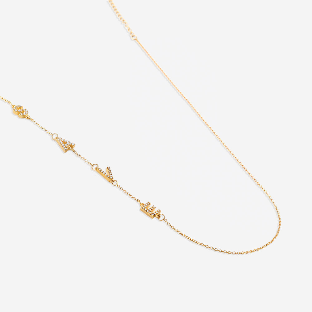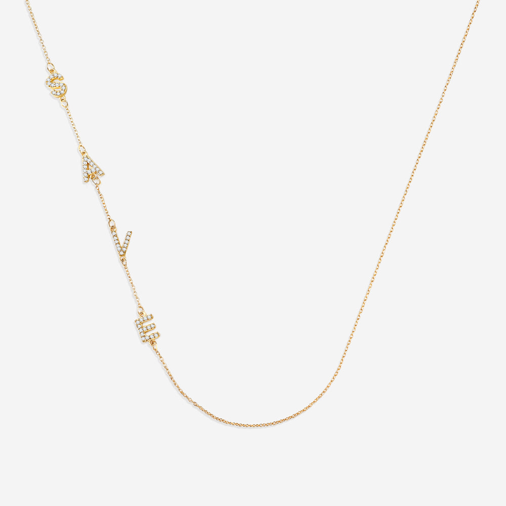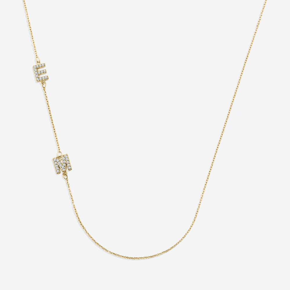 This elegant necklace features initials set horizontally, embellished with sparkling pave stones that add a touch of glamour and sophistication. The sideways design gives it a modern, chic look, making it a stylish accessory for both everyday wear and special occasions. Crafted with high-quality materials, this necklace is perfect for celebrating your own initials or gifting someone special with a personalized touch.